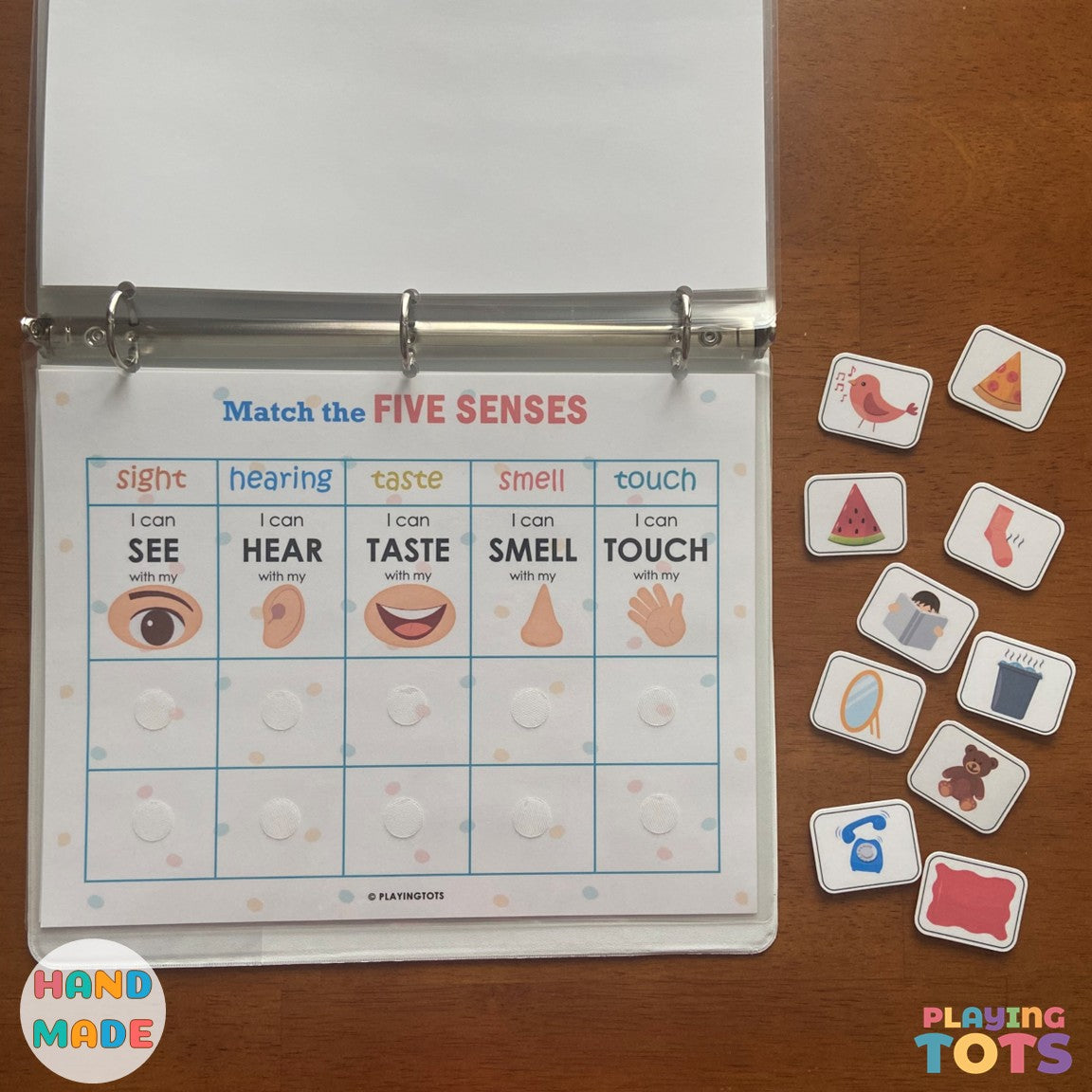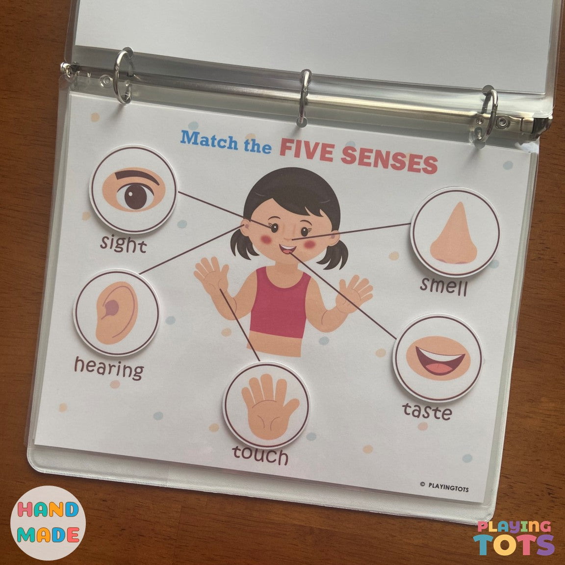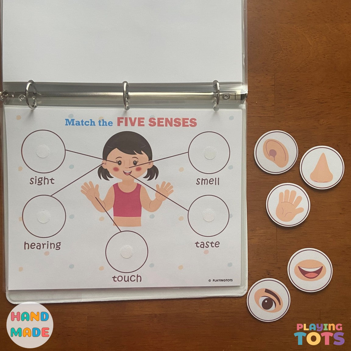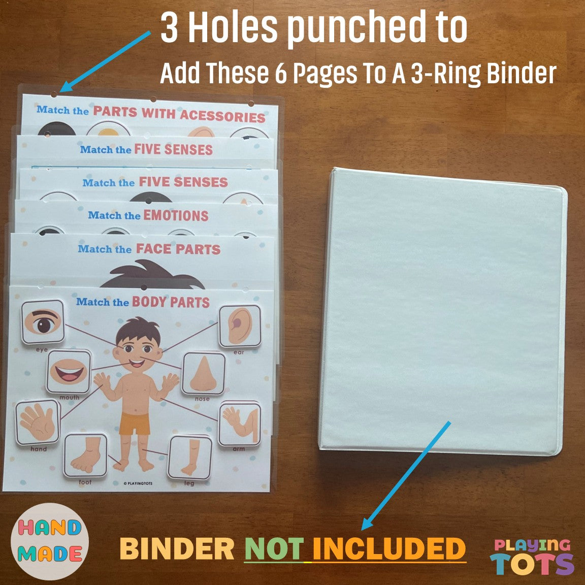 Grab these laminated Learning activity pages and add to your Toddler's Busy Book/ Learning Binder. This includes Body parts matching, Five Senses matching and emotions matching activities.