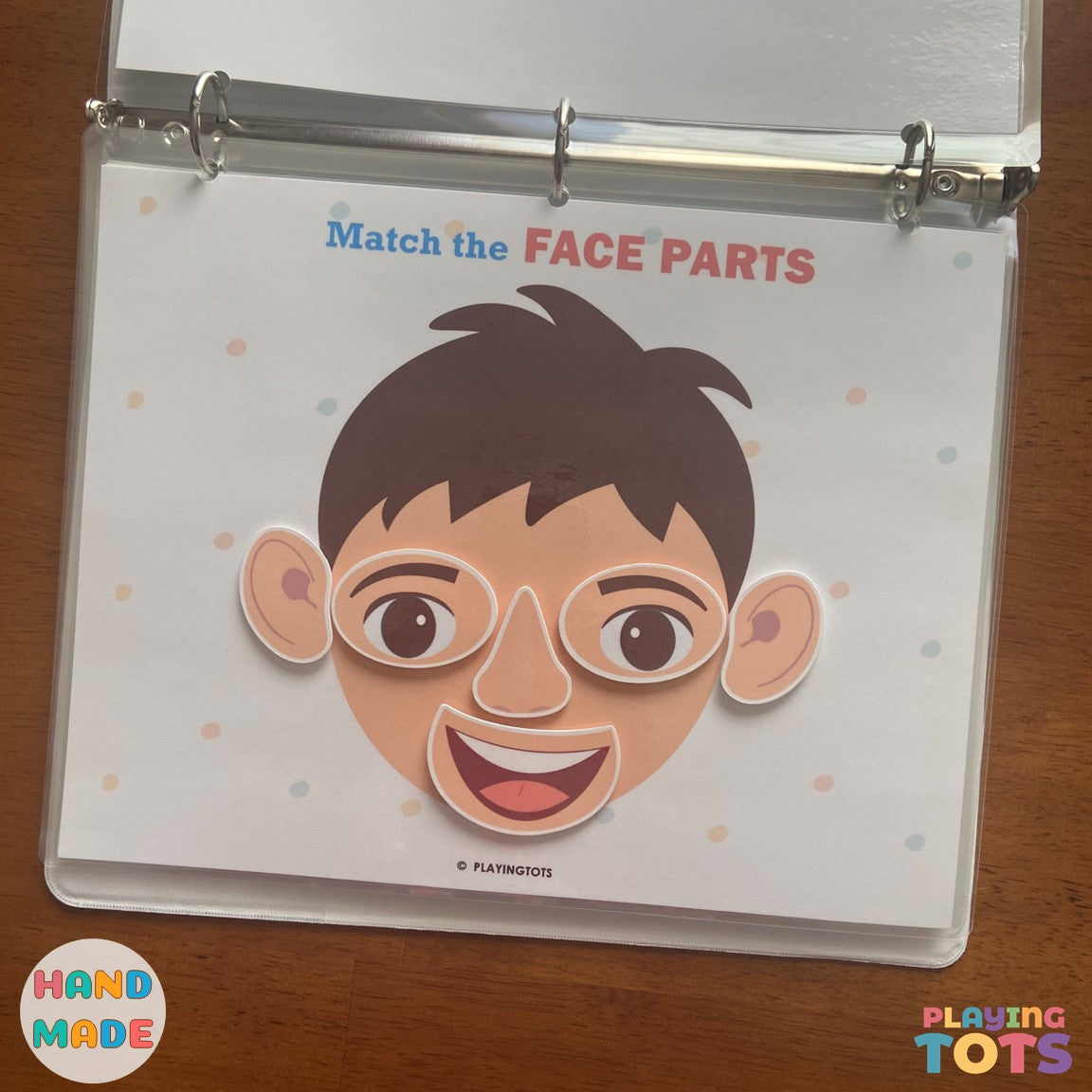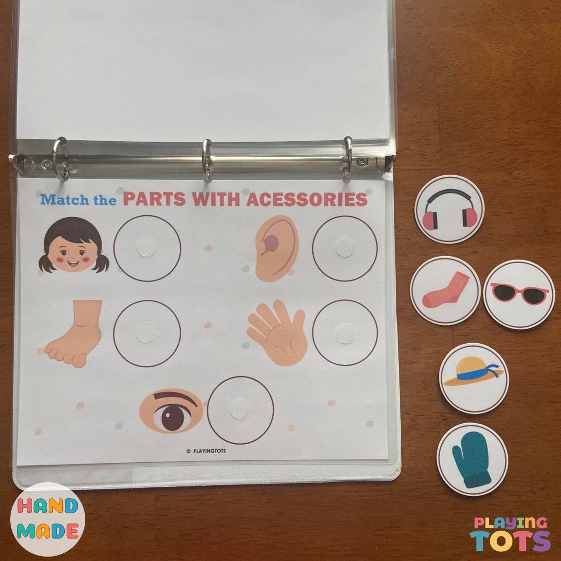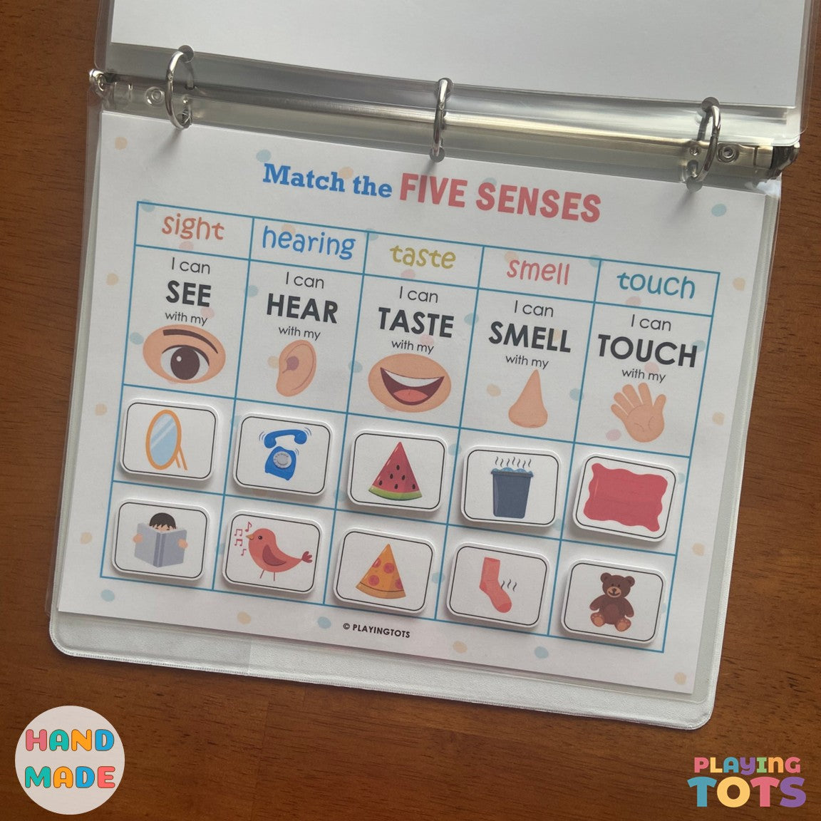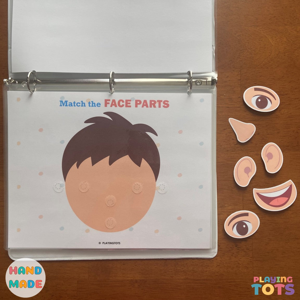 Grab these laminated Learning activity pages and add to your Toddler's Busy Book/ Learning Binder. This includes Body parts matching, Five Senses matching and emotions matching activities.
