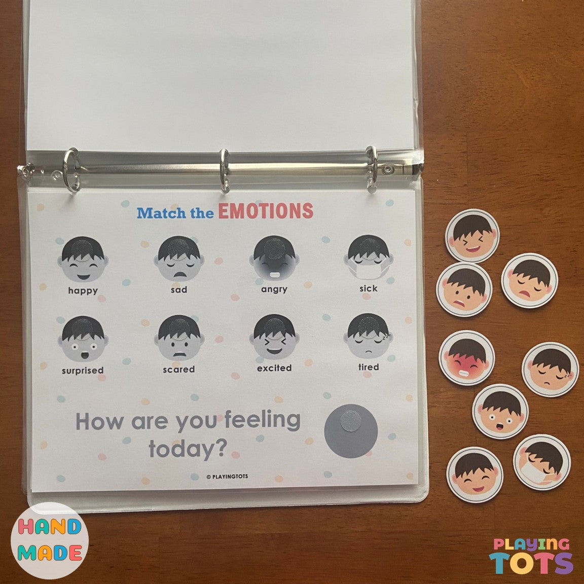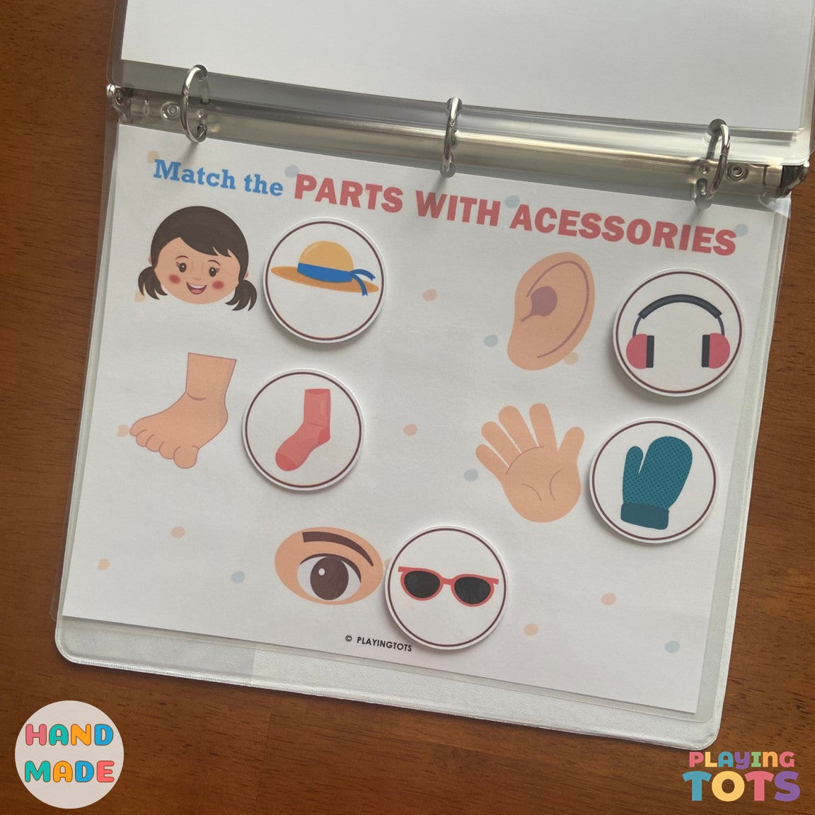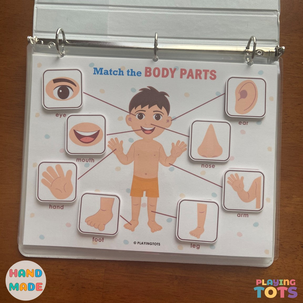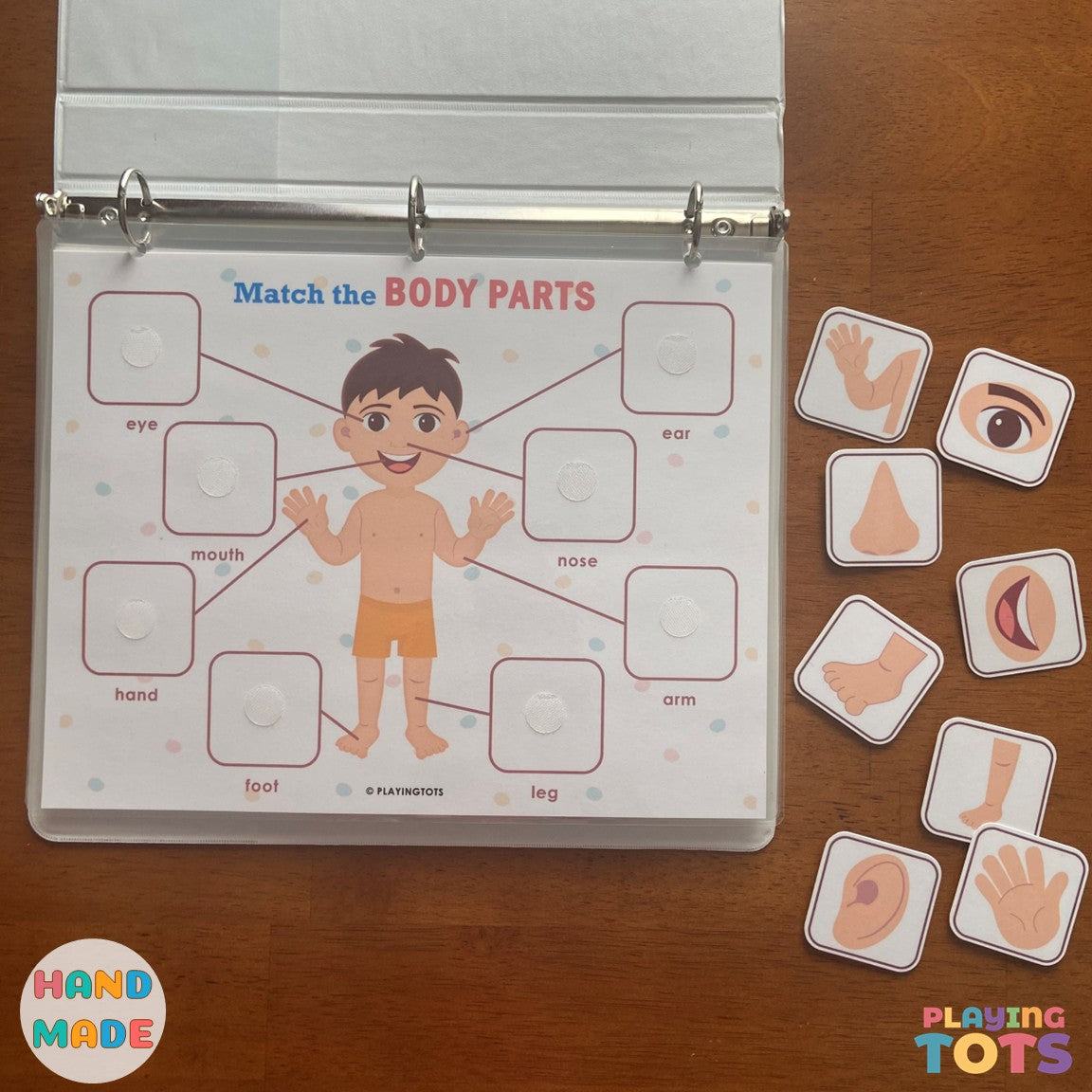 Grab these laminated Learning activity pages and add to your Toddler's Busy Book/ Learning Binder. This includes Body parts matching, Five Senses matching and emotions matching activities.